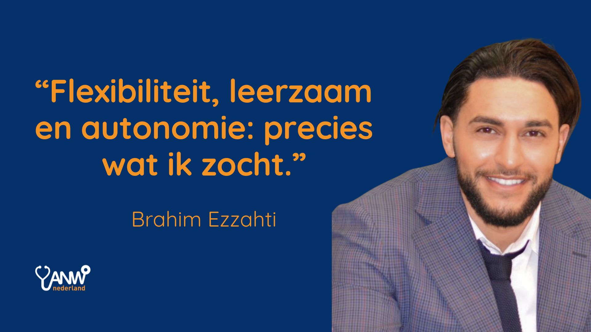 De jonge arts Brahim werkt inmiddels een jaar als ZZP’er bij ANW Nederland, naast zijn zoektocht naar welke specialisatie het beste bij hem past. Na zijn opleiding wist hij dat hij zich eerst breed wilde oriënteren. Hij liep keuzecoschappen in onder andere de psychiatrie en verdiept zich nu in de ouderengeneeskunde en de VG-zorg. “Ik wilde ervaren wat er bij me past. ANW-diensten bleken voor mij de ideale manier om praktijkervaring in de ouderengeneeskunde op te doen, zelfstandig te werken én te ontdekken waar mijn kracht ligt.”